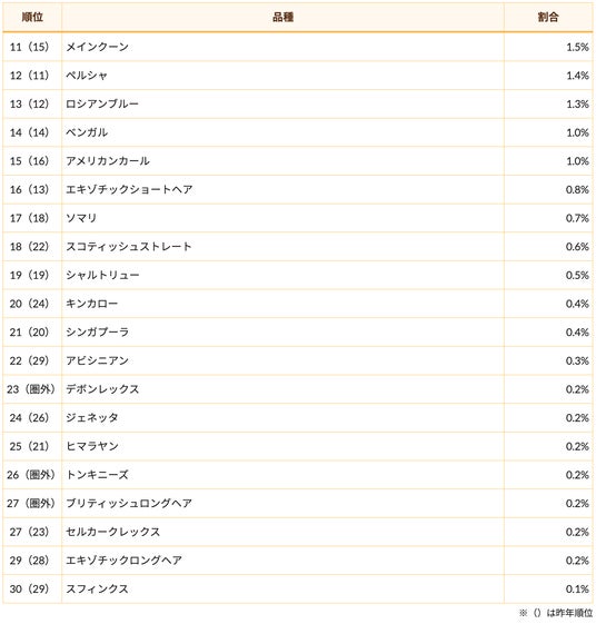 首位の顔ぶれが安定している一方で、11位から30位のランキングには大きな変化がありました。なんと昨年は惜しくも圏外だった猫種が、今年は新たに3品種もランクインしました!