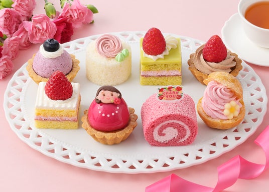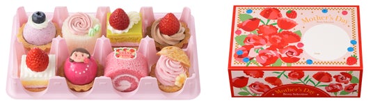 華やかな花束をイメージしたプチデコレーションケーキや、お母さんをイメージしたかわいいプチケーキのアソート、みんなでシェアできるチーズスフレ。人気の苺のショートケーキは期間限定でバラの花デザインのピック付きに、好評販売中の<ガーナ>濃厚生チョコケーキは、ピックのロゴを「Ghana」から「haha」に変えて販売します。
