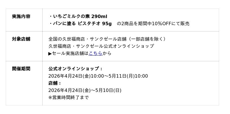 株式会社サンクゼール(本社:長野県飯綱町)が展開する「久世福商店」「サンクゼール」は、本日2026年4月24日(金)より、全国の店舗(一部店舗を除く)と公式オンラインショップにて、人気商品が10%OFFになる「GWセール」を期間限定で開催いたします