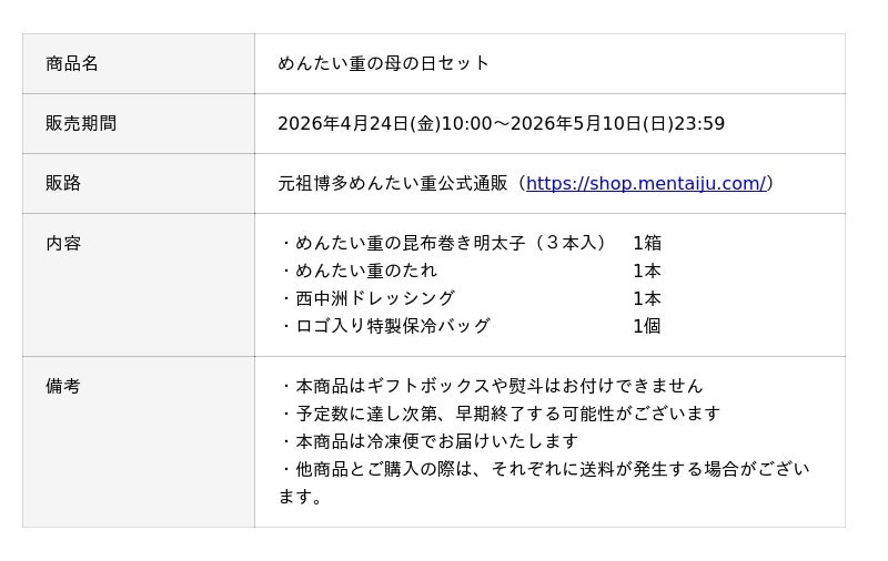 元祖博多めんたい重株式会社は、2026年4月24日(金)より「めんたい重の母の日セット」を公式通販限定で販売いたします。
