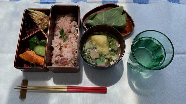 寝坊したのはもちろんです。ご近所の新倉邦子さんからいただいた「桜ごはん」と「桜の塩漬け」をお弁当に。