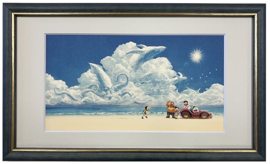 特に象徴的であり、冒険への希望やワクワクとした印象を感じさせる「青空の下、仲間たちが水中バギーと共にあるシーン」をジークレー版画にしました。