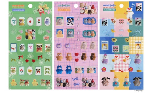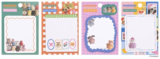 ラインナップは、シールやメモ、ノートなどの紙もの文具を中心とした全8アイテムです。レトロなカラーリングの柄や模様とmojojojoの世界観がマッチしたかわいいデザインです。シールには帽子やリボンなどのパーツの絵柄も含まれているので、着せ替えのように楽しむこともできます。