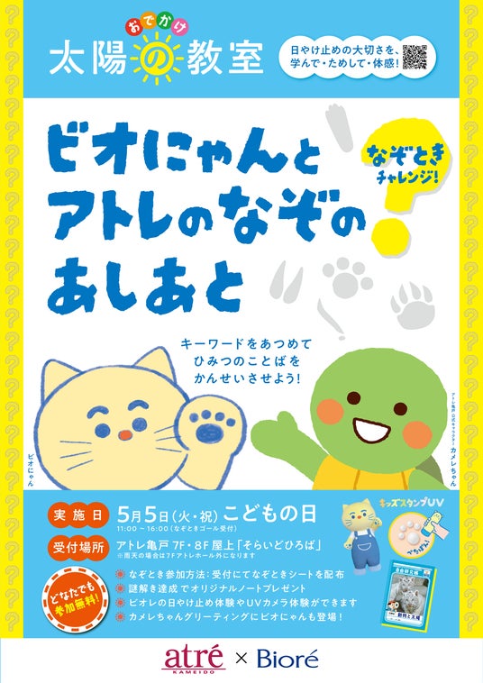 動物とのふれあいコーナーや記念撮影、動物と太陽とのかかわりを謎解きを通じて研究できるイベントです。また、5月5日(火・祝)にはアトレ亀戸公式キャラクターの「カメレちゃん」やビオレ公式キャラクター「ビオにゃん」が登場します。