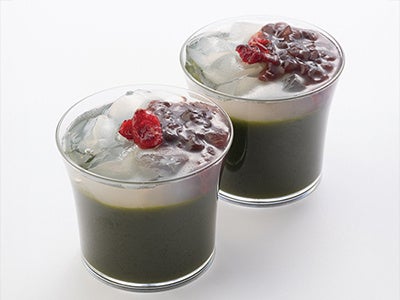 香り高い抹茶ゼリーに、もっちりとしたわらび餅と、粒あんをトッピング