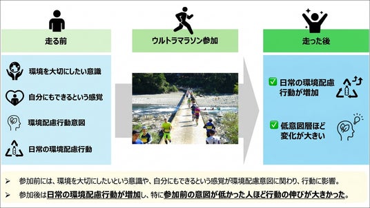 - 四万十川ウルトラマラソンの初参加者122人を対象に、1.参加前、2.参加2~3週間後、3.参加4~5週間後の3時点で追跡した結果、リサイクルや節電など実際の環境配慮行動に有意な増加を確認。- 特に、参加前の環境への意識(環境配慮意図)が低かった参加者ほど参加後の行動変化が大きく、自然資源を活用したスポーツイベントが、参加者の価値観や日常行動の変容を促す可能性を示唆。