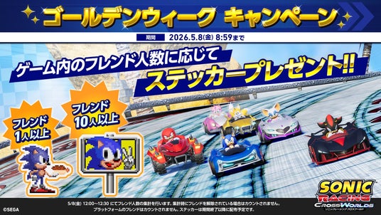 株式会社セガは、発売中の『ソニックレーシング クロスワールド』について、PlayStation(TM) Storeおよび PC(Steam)にて40%OFFとなる「ゴールデンウィークセール」を開催中です。PlayStation(TM) Storeでは2026年5月6日(水)まで、PC(Steam)では5月8日(金)までセールを実施予定です。