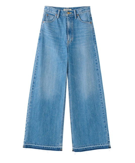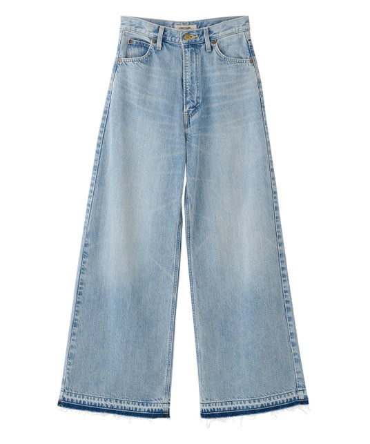 腰からストンと落ち、裾に向けてほんのり広がるフレアラインで、気になる脚のラインを美しくカバー。加工後にあえて裾のステッチを解いたリメイクライクな始末。手の込んだヴィンテージ感が漂います。ハイウエスト設計で腰位置を高く見せ、ワイドなのに圧倒的スッキリ見えするシルエットに仕上げました。
