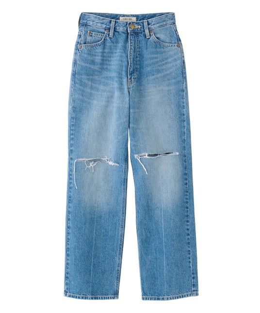 脚のラインを拾わないストレートワイド。ハイウエストとの相乗効果で、リラックス感がありつつも脚長効果は抜群。エッジの効いた膝部分の大胆なカットオフダメージが、いつものコーデにアクセントをプラスしてくれます。甘めブラウスを合わせた、大人の甘辛ミックスコーデがオススメ。