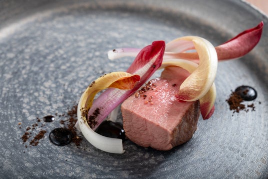 ビジネスシーン:落ち着いたテーブル席で、厳選されたワインと共に、素材を活かしたメインディッシュを堪能。
