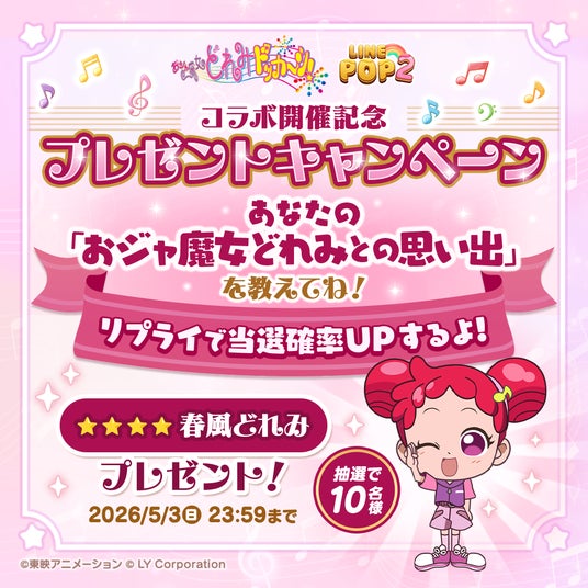 コラボ期間中、LINE POP2公式X(旧Twitter)アカウント(@LINE_POP2_JP)をフォローし、対象のポストをリポストすると抽選でコラボ限定ミニモン「★4 春風どれみ」が当たります。