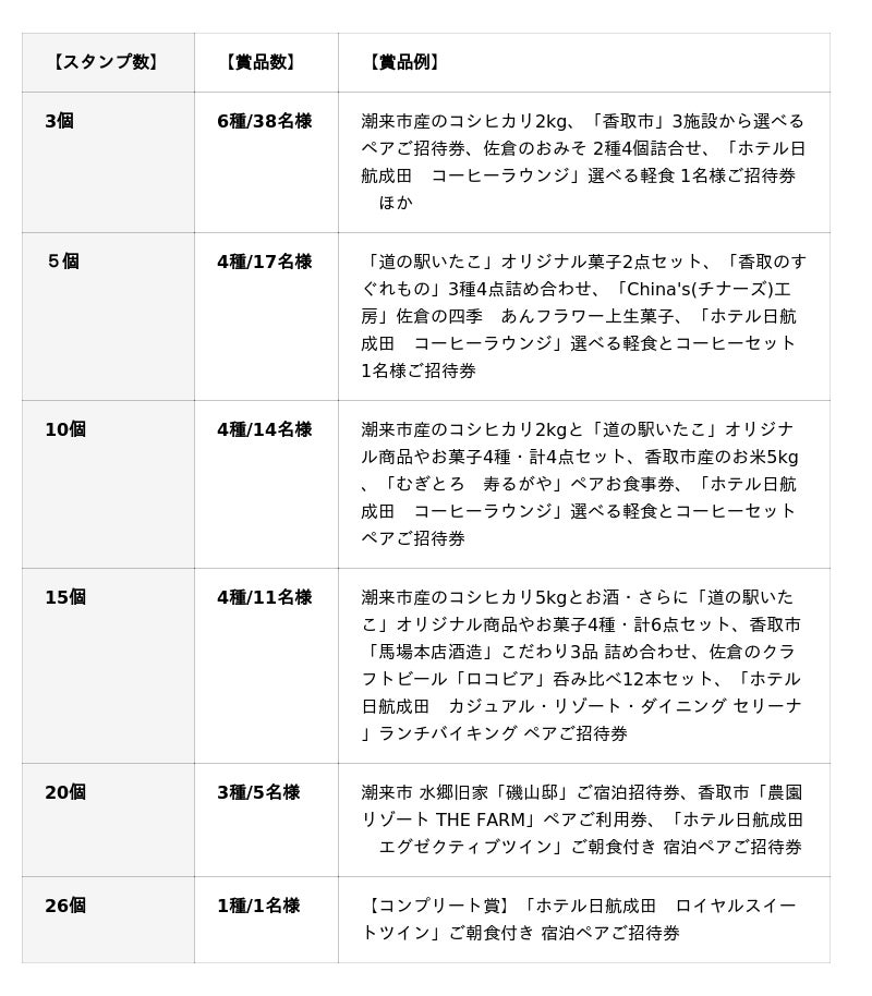 本スタンプラリーでは、3市の観光スポットへの来訪や飲食店・ホテル日航成田館内の対象レストランご利用の際に、スマートフォンのGPS機能や指定の飲食店設置の二次元バーコードの読み込みにより、最大26個のスタンプを獲得いただけます。スタンプは、集めた数に応じて3個から応募でき、抽選で当たる賞品には各市の特産品や施設利用券、ホテル日航成田のレストラン利用券をはじめ、ロイヤルスイートルームの宿泊券など全22種・86名様分をご用意しています。
