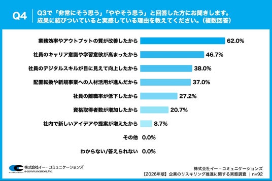 「Q4. Q3で「非常にそう思う」「ややそう思う」と回答した方にお聞きします。成果に結びついていると実感している理由を教えてください。(複数回答)」(n=92)と質問したところ、「業務効率やアウトプットの質が改善したから」が62.0%、「社員のキャリア意識や学習意欲が高まったから」が46.7%、「社員のデジタルスキルが目に見えて向上したから」が38.0%という回答となりました。