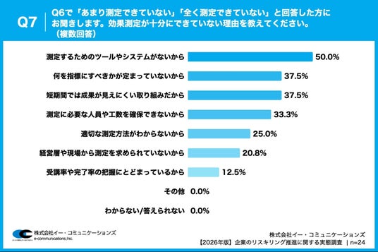 「Q7. Q6で「あまり測定できていない」「全く測定できていない」と回答した方にお聞きします。効果測定が十分にできていない理由を教えてください。(複数回答)」(n=24)と質問したところ、「測定するためのツールやシステムがないから」が50.0%、「何を指標にすべきかが定まっていないから」が37.5%、「短期間では成果が見えにくい取り組みだから」が37.5%という回答となりました。