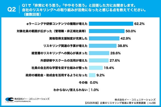 「Q2. Q1で「非常にそう思う」「ややそう思う」と回答した方にお聞きします。自社のリスキリングへの取り組みが活発になったと感じる点を教えてください。(複数回答)」(n=98)と質問したところ、「eラーニングや研修コンテンツの種類が増えた」が62.2%、「対象社員の範囲が広がった(管理職・非正規社員等)」が50.0%、「資格取得支援制度が充実した」が42.9%という回答となりました。