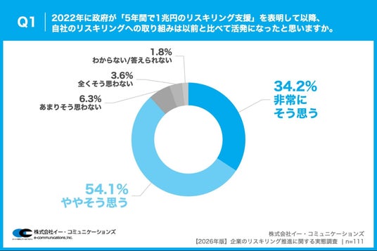 「Q1. 2022年に政府が「5年間で1兆円のリスキリング支援」を表明して以降、自社のリスキリングへの取り組みは以前と比べて活発になったと思いますか。」(n=111)と質問したところ、「非常にそう思う」が34.2%、「ややそう思う」が54.1%という回答となりました。