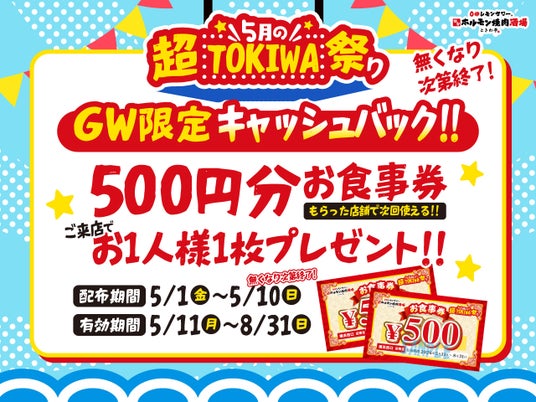 ゴールデンウィークを迎える5月の期間中に日頃の感謝を込めて、『5月の超TOKIWA祭り』と題し、5月1日(金)~5月10日(日)の10日間限定で『GW限定キャッシュバック』を開催いたします。期間中にご来店いただいたお客様に、500円分のお食事券をプレゼントします。