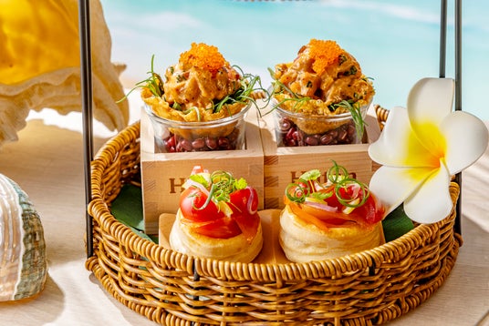 南国気分を盛り上げるおしゃれな籠風スタンドには、伝統的なハワイ料理に洗練されたフレンチアレンジを掛け合わせたハワイXフレンチフュージョンの前菜“セイヴォリー・ププ”をご用意しました。ハワイで古くから親しまれるタロイモの葉“ルアウリーフ”をココナッツミルクで丁寧に煮込み、やわらかなタコとともにパイ生地に閉じ込めた「タコ・ルアウキッシュ」、厚切りスパムを香ばしく炙り、パイナップルの甘酸っぱさを効かせた蒲焼きソースをまとわせ、海苔で包んだ「グリルド・スパムむすび メダリオン」は、ハワイのローカルフードを思わせる食欲そそる一品です。さらに新鮮なマグロにスパイシーマヨネーズと胡麻を合わせ、ワンタンのカップに乗せた「スパイシー・アヒポキ」、サクサクのバターパイ生地に、ハワイの定番料理、ロミロミサーモンをイメージして仕上げた「ロミロミサーモンのヴァル・オ・ヴァン」も登場。スモークサーモン、トマトとオニオンを合わせ、爽やかなシトラスの香りを添えました。