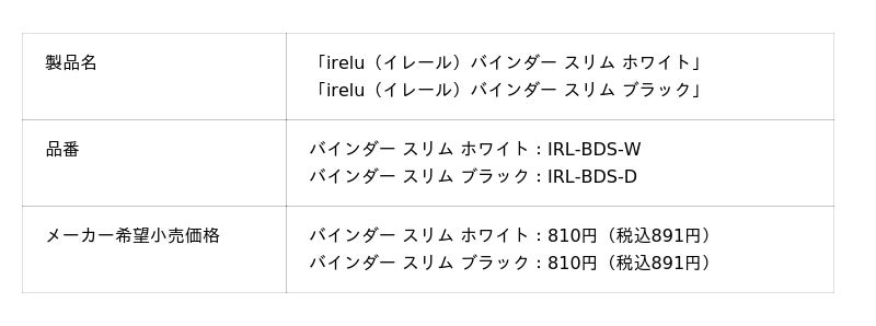 - 「irelu バインダーシリーズ」に5種類、「irelu スリーブシリーズ」へ3種類新たに追加- 「irelu バインダーシリーズ」にバインダー スリムが登場。複数冊を棚に並べてもスペースを圧迫せず、一冊ずつ分けて管理するのに最適なサイズ感