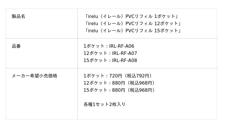 - 「irelu PVCリフィル 1ポケット」、「irelu PVCリフィル 12ポケット」、「irelu PVCリフィル 15ポケット」は白台紙の採用によりグッズを主役に見せる設計で、すべてのポケットに蓋(フラップ)を装備し大切なグッズの落下を防止