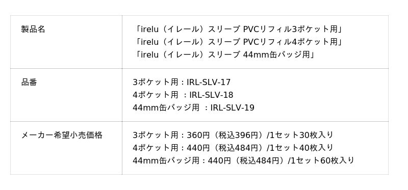 - 「irelu スリーブ PVCリフィル3ポケット用」、「irelu スリーブ PVCリフィル4ポケット用」、「irelu スリーブ 44mm缶バッジ用」は、高透明素材でグッズの魅力を損なわず、テープ位置で高さ調節可能な設計であり、それぞれ「irelu PVCリフィル」の3ポケット、4ポケット、15ポケットのポケット内寸に収まるように設計