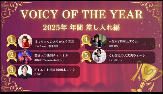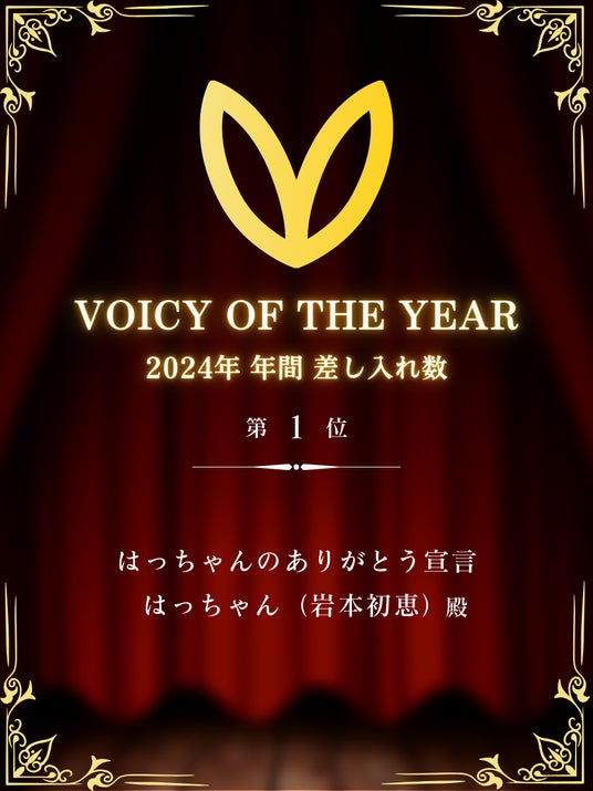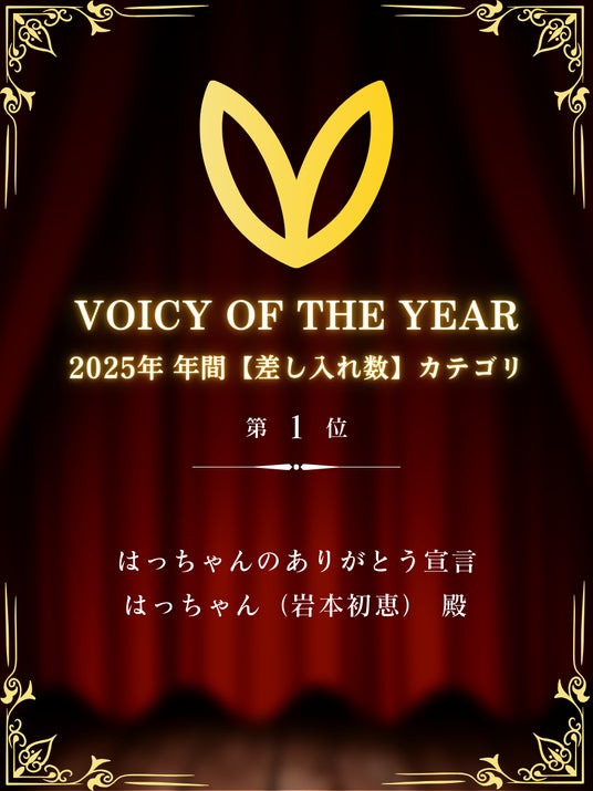 2024年と2025年の年間トータルランキング「VOICY OF THE YEAR」の「差し入れ数」部門で2年連続年間1位に輝きました。Voicyで多くの著名な皆様が配信される中での「差し入れ数」年間1位獲得は、はっちゃんの発信内容に対する多くのリスナー様からのサポートの証です。しかも2年連続1位獲得の快挙となりました。