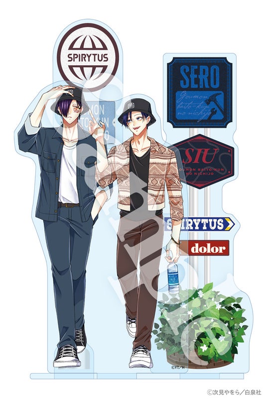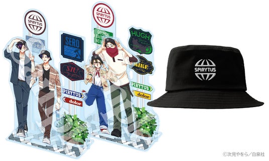 同時発売のスピリタス社バケットハットをお揃いでかぶるセロとシウを、次見やをら先生が描きおろし。描きおろしイラストを使用したジオラマ仕様のアクリルスタンドです。お揃いのハットをかぶったセロとシウが街を仲良く散歩する様子を立体的に表現しています。スピリタス社のロゴや名前が書かれた標識が付属。コミックス最新第8巻とセットでお届けします。