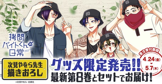 本日4月24日から5月7日までの期間中にヤングアニマルWebストアにて予約注文をいただいた方に、『拷問バイトくんの日常』第8巻と、「スピリタス社バケットハット」や、バイトくんたちがお揃いのハットを着用している描きおろしイラストを使用した「アクリルジオラマ」をセットにしてお届けします。