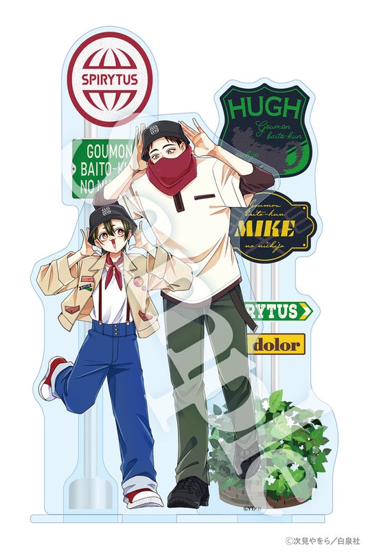 次見やをら先生描き下ろしイラストを使用したミケ&ヒューver.のアクリルスタンド。お揃いでかぶっているスピリタス社バケットハットを自慢するミケとヒューが仲良く歩く様子を立体的に表現しています。スピリタス社のロゴや名前が書かれた標識が付属。コミックス最新第8巻とセットでお届けします。