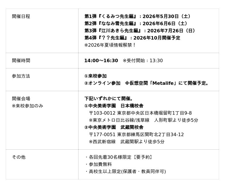 本プロジェクトは、業界の第一線で活躍するクリエイターを講師に招き、その専門的な技術とマインドを直接伝承する全4回の特別講義です。