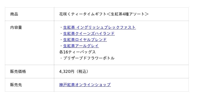 神戸紅茶株式会社(本社:兵庫県神戸市東灘区住吉浜町、社長:丸山 輝真)は、紅茶とお花がセットになった2種類の「花咲くティータイムギフト」の予約受付を開始いたしました。