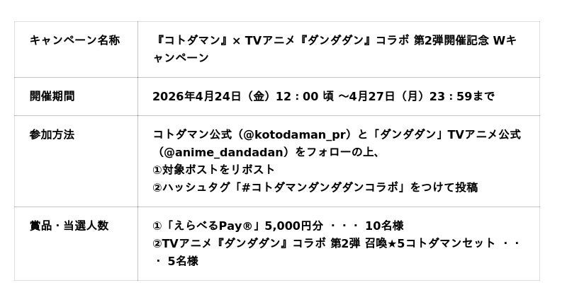 さらに、コラボ開催を記念して、「えらべるPay(R)」や「TVアニメ『ダンダダン』コラボ 第2弾 召喚★5コトダマンセット」が抽選で当たるXキャンペーンを開催します。なお、本コラボの詳細は、4月27日(月)20:00より、コトダマン公式YouTubeチャンネルで配信するコトダマン公式放送【GODステーション】で発表します。
