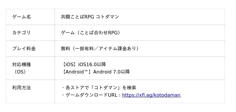 スマートフォンで遊べる「ことば」で闘う新感覚RPGです。文字の精霊「コトダマン」を組み合わせて「ことば」をつくり、ステージクリアを目指します。つくった「ことば」の長さや数で敵に与えるダメージが変化し、最大4人で協力しながら遊ぶマルチプレイでは、友だちや家族とワイワイ盛り上がりながら、それぞれの知識を出し合って「ことば」づくりを楽しむことが可能です。生き物、食べ物、地名、歴史上の人物から、流行のあの「ことば」まで、29万語以上に対応。「ことば」は日々追加しており、無限に楽しみが広がる、究極のことば遊びゲームです。2025年10月時点で、累計利用者数600万人を突破しています。