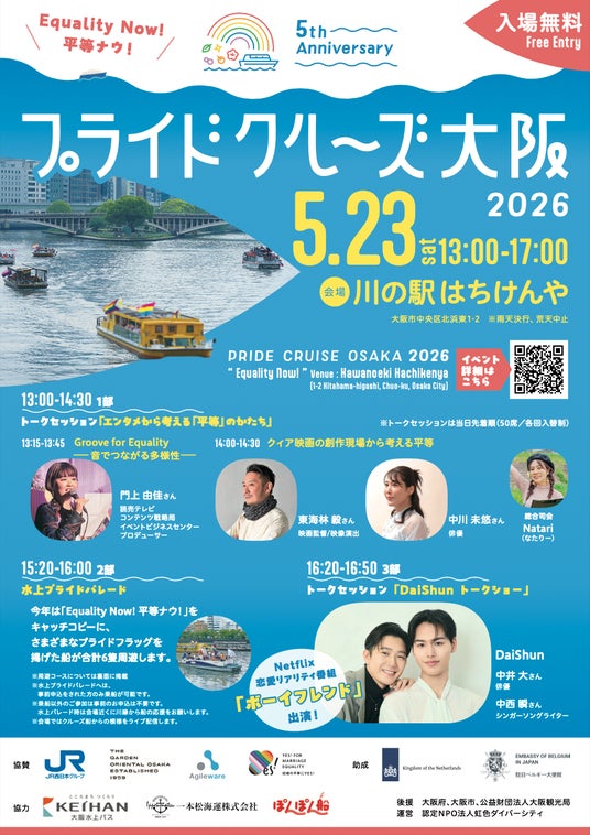 多様なプライドフラッグを掲げた船が大阪の川を周遊する「水上プライドパレード」を実施し、さらに今年は記念すべき5周年の節目として豪華なゲストを迎え「Equality Now!(平等ナウ!)」をテーマに開催します。