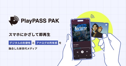 PlayPASS PAKは、NFC搭載グッズをスマートフォンにかざすだけで、音源や映像、画像コンテンツを楽しむことができるデジタルの利便性とアナログの所有感を融合させた新世代の再生メディアです。近年、韓国を中心に、さまざまな技術を活用しスマートフォンと連携して音楽を視聴することができるデジタル形式の再生メディアが増加、次世代の音楽体験として注目されています。