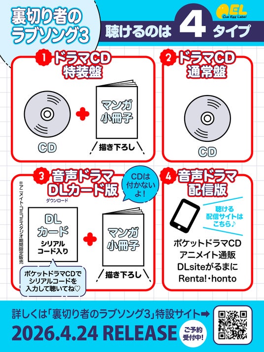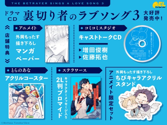 株式会社リブレ(本社:東京都新宿区、代表取締役社長:是枝由美子)は、ドラマCD「裏切り者のラブソング3」を2026年4月24日に発売致しました。https://www.b-boy.jp/special/uralove/cd/