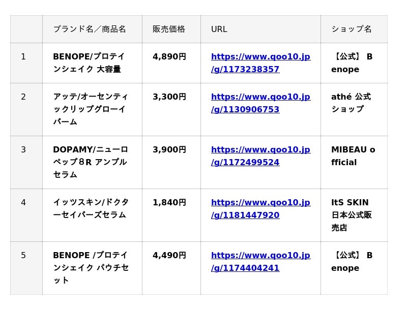2026年3月にデビューした商品の中から1位にランクインしたのは、「BENOPE」のプロテインシェイク 大容量。トッピングたっぷりのプロテインシェイクです。2位は、「アッテ」のオーセンティックリップグローイバーム。リップグロスをそのまま固めたようなリップバームです。3位の「DOPAMY」のニューロペップ8R アンプルセラムは、肌にうるおいとハリを与え、健やかに保ちます。