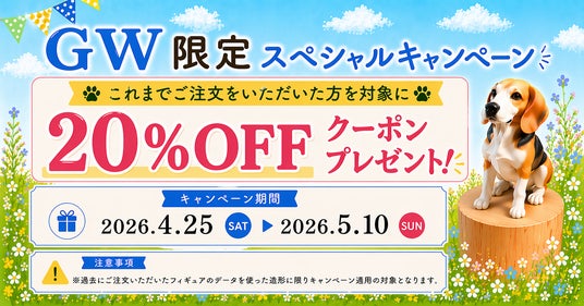 写真1枚から愛するペットの3Dフィギュアを作成できるサービス「ちょこんとフィギュア Powered by DMM.make 3D PRINT」にて、これまでサービスをご利用いただいた方へ感謝の気持ちをこめて、「GW限定キャンペーン」を開催いたします。20%オフクーポンをプレゼントいたします。ぜひこの機会にサービスをご利用ください。