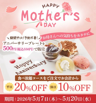 コロワイドグループの株式会社レインズインターナショナルが展開するしゃぶしゃぶ温野菜は、2026年5月7日(木)から5月20日(水)までの期間限定で、食べ放題コースが平日20%OFF、休日10%OFFとなる「母の日キャンペーン」を実施いたします。また、同期間に「アニバーサリープレート」も550円(税込)でご用意しております。この機会にぜひ、“ありがとう”の気持ちを温野菜でお届けください。