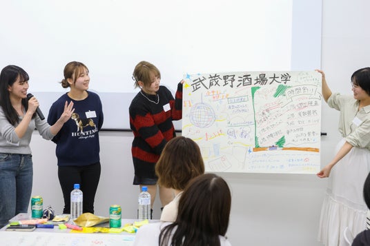 特別講義では、飲む人、飲まない人、飲めない人、誰もがお酒の場を楽しめる文化の創出に向けた第一歩として学生の皆さんと「GREEN’S FREE ACTION」のスタッフが一緒になりワークショップを実施し、「みんなが楽しめる“未来の酒場”」のアイデアを創出しました。9月からは第2弾として、「誰もがお酒の場を楽しめる文化」の創造につながるソーシャルデザインの作品制作※を行います。さらに12月以降の第3弾では、第2弾で制作した作品の対外発信を行い、共感の輪の拡大を目指します。これらの取り組みはすべて学部3年生以上(20歳以上)の学生を対象に実施します。
