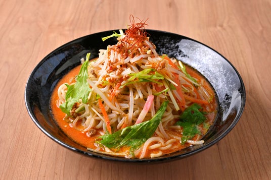 胡麻風味の冷たい豆乳ピリ辛スープと冷製もちもち自家製麺を特製肉そぼろとシャキシャキ野菜と一緒にどうぞ。