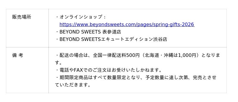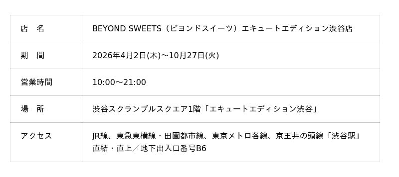 - 店 名: BEYOND SWEETS表参道店(ビヨンドスイーツ表参道店)- 運営会社:株式会社B&H