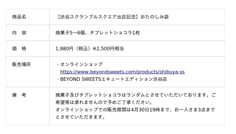 「BEYOND SWEETSエキュートエディション渋谷店」では、渋谷スクランブルスクエア出店を記念し、焼菓子5~6個とタブレットショコラ(1枚972円)が入った2,500円相当のスイーツ詰合せを1,980円にて販売しています。4月30日までは、BEYOND SWEETSオンラインショップでも数量限定で販売しています。
