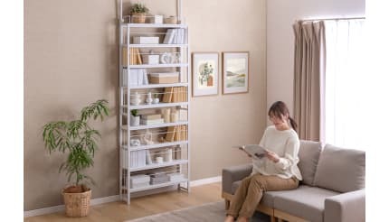 「突っ張り式スリム本棚」は、天井に固定して使用する「突っ張り式」で、高さのある設計ながら安定性と収納力を両立している。設置にあたって穴を開ける必要はなく、天井に傷がついてしまうこともないので、賃貸住宅でも安心して設置できる。また、すべての棚が高さ調整可能となっている。