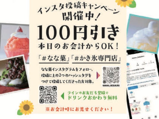 『なな菓』では、公式インスタグラムアカウントをフォローし、「#なな菓」、「#かき氷専門店」の2つのハッシュタグをつけて投稿してくださったお客様に、当日のお会計の総額から100円をお値引きするインスタグラムキャンペーンを開始いたしました。下記の詳細をご覧の上、ぜひご利用ください。