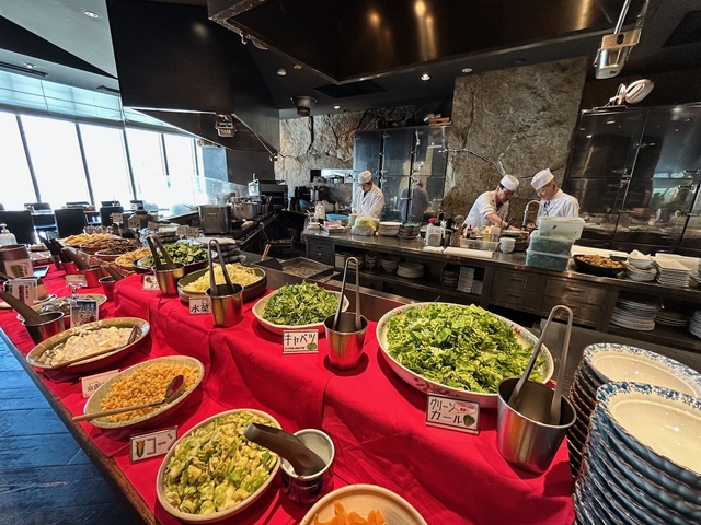 「料理が届く前にビュッフェをご利用ください。サラダや惣菜の他、食後のデザートのご用意もあります」