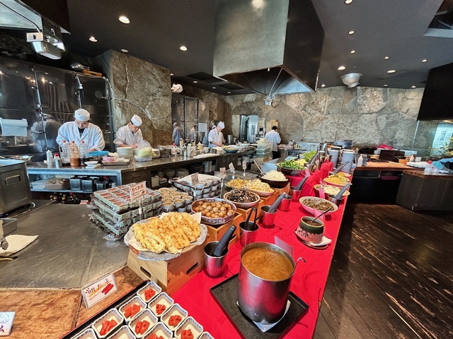 どんな料理があるのか、ビュッフェコーナーを視察することにした。グリーンカール、水菜、キャベツ、タマネギ、生もずく、マカロニサラダの他、ひじき、竹輪の天ぷら、明太子の他、サトイモが並んでいた。