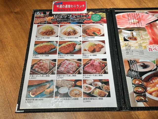 夜は宮崎県産霧島黒豚のしゃぶしゃぶを売りにしているらしいのだが、ランチはその黒豚を使ったトンカツや角煮、生姜焼きなどの定食にサラダや惣菜、デザート付いたビュッフェが人気だというのだ。