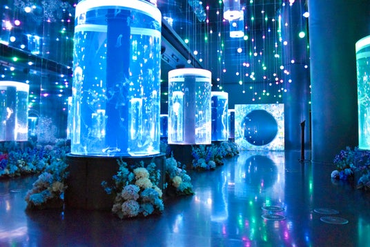 本コラボレーションでは、クラゲの造形や生態と、花の構造や色彩を掛け合わせた5つの水槽を展開。例えば、同エリアを象徴する水槽には、成長すると傘や触手が青色になる「ヒトダマクラゲ」を展示。澄み渡るような青色が特徴的なネモフィラなどの装飾を施しました。