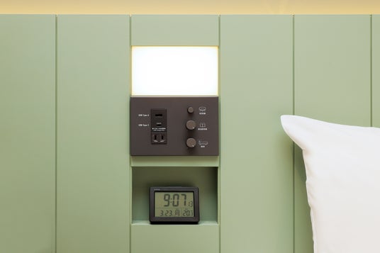 - ヘッドボードとテーブルにUSB Type-A/Type-Cとコンセントを集約し、必要なときにストレスなく使える設え。